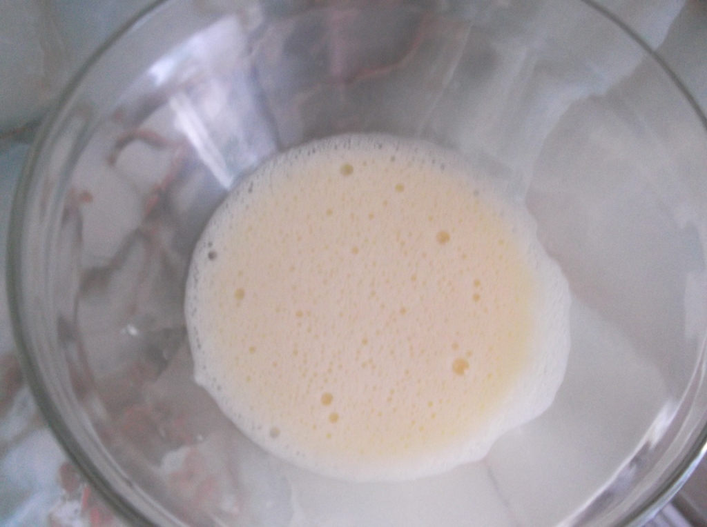 Яйцо взбиваем примерно 3 минуты, чтобы получилась пена (яйцо должно быть комнатной температуры!). Затем вводим молоко и перемешиваем.